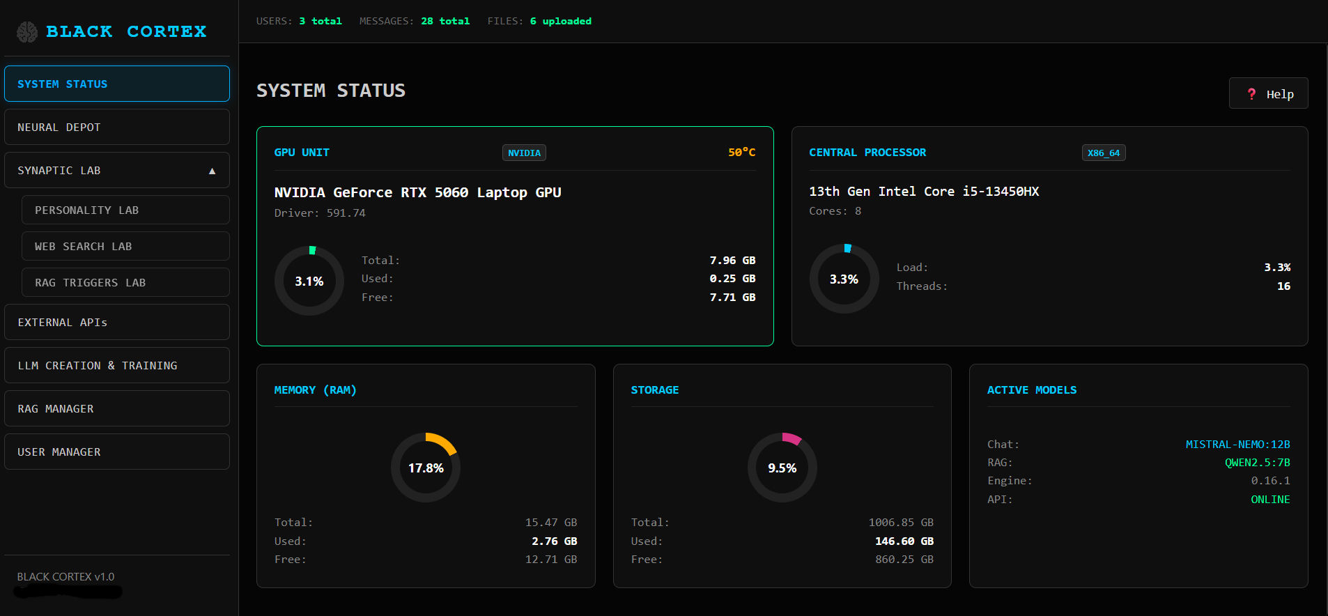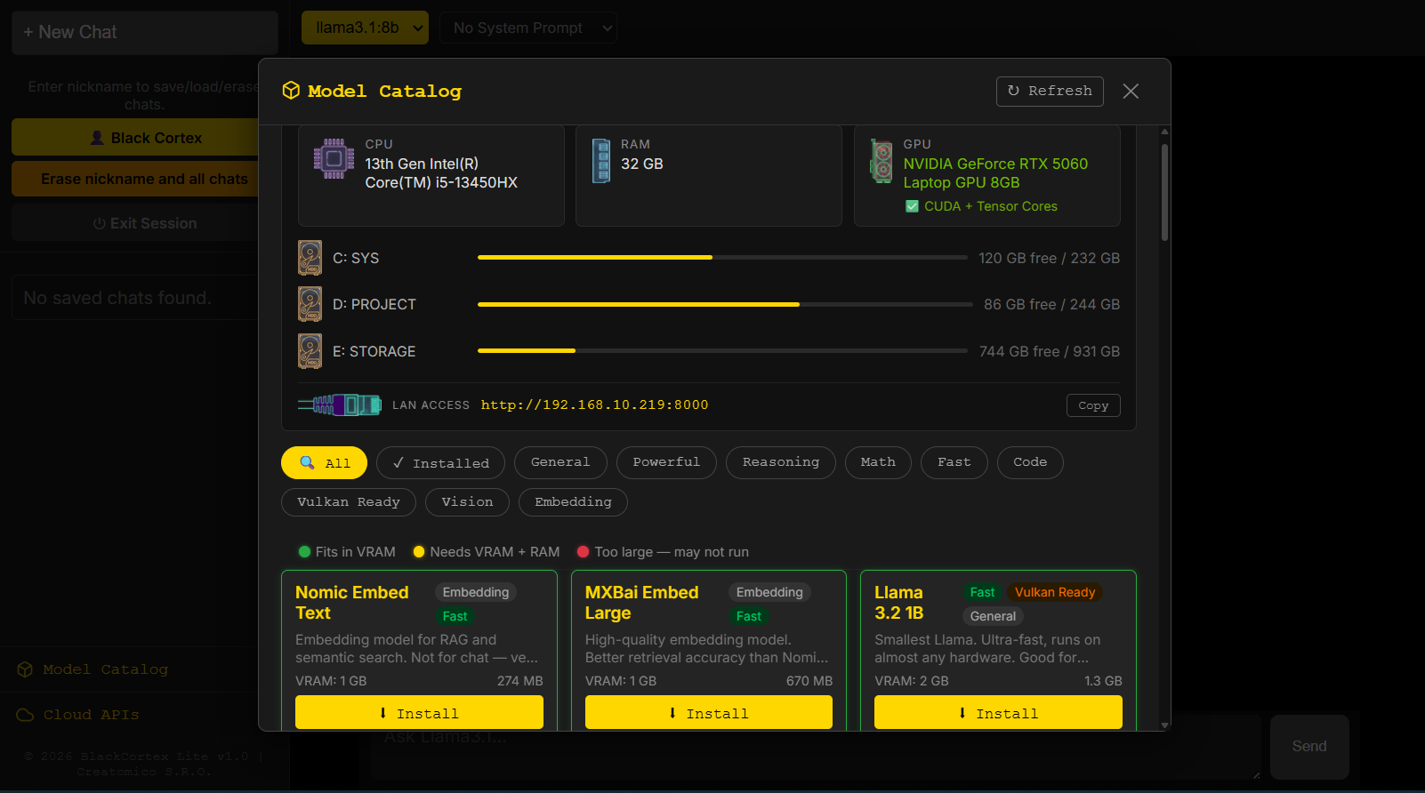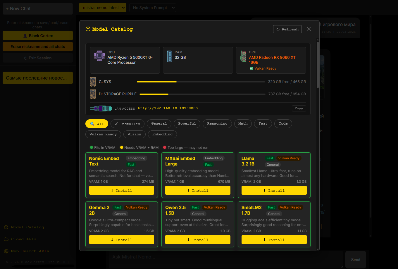 LLM VibeCheck был полностью переработан и такое название перестало существовать. Теперь это два продукта: BlackCortex Lite для домашнего использования, под капотом Ollama с поддержкой AMD через Vulkan бэкенд, так что владельцы красных карточек наконец в деле. И полноценная RAG платформа BlackCortex AI для запуска в Docker. Почему BlackCortex? А, вот хрен его знает, может «жизни черных кортексов тоже важны» (улыбка тролля)