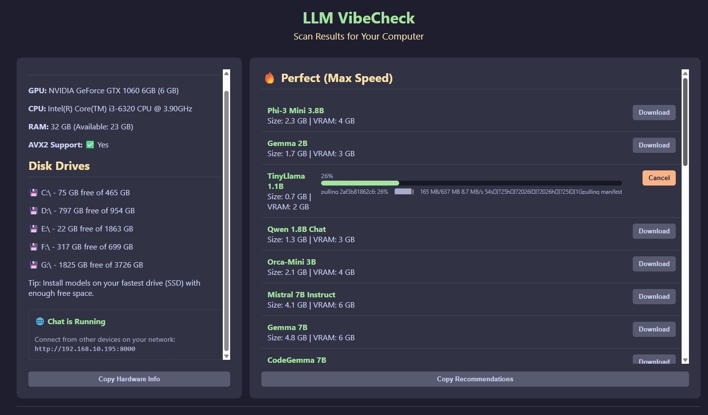 По прошествии некого времени, в июле 2025 года был создан LLM VibeCheck, он производил сканирование железа и на этом основании выдавал локальные LLM модели, которые будут работать без проблем на вашем железе, в рамках существующей градации: зелёные - работают быстро, жёлтые - гибридный мод с использованием GPU + RAM, красные - невозможно запустить.