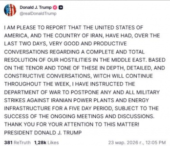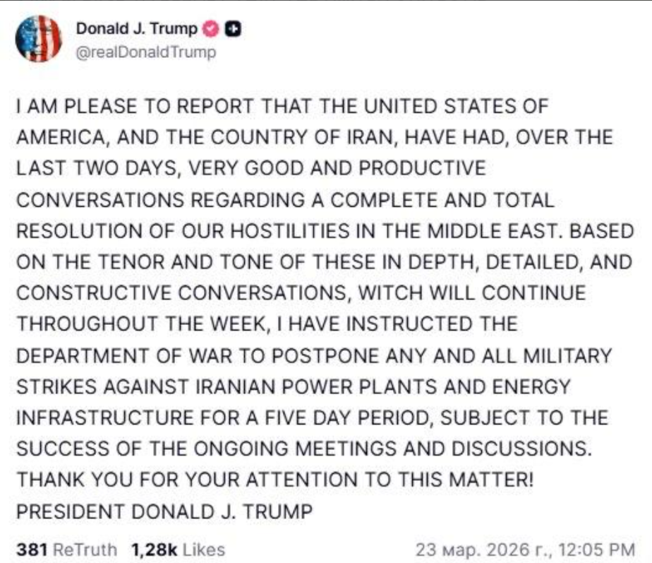 Я рад сообщить, что Соединенные Штаты Америки и Иран за последние два дня провели очень хорошие и продуктивные переговоры относительно полного и всестороннего урегулирования наших военных действий на Ближнем Востоке. Исходя из характера и тона этих глубоких, подробных и конструктивных переговоров, которые продолжатся в течение недели, я поручил Министерству обороны отложить любые военные удары по иранским электростанциям и энергетической инфраструктуре на пять дней, при условии успешного проведения текущих встреч и обсуждений. СПАСИБО ЗА ВНИМАНИЕ К ЭТОМУ ВОПРОСУ! ПРЕЗИДЕНТ ДОНАЛЬД ДЖ. ТРАМП