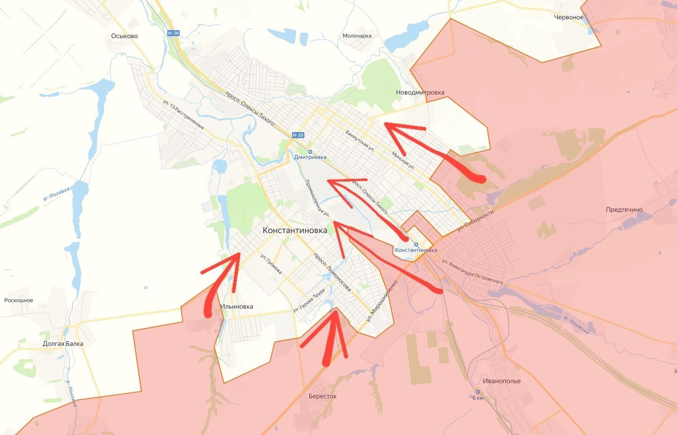 Что происходит в Константиновке? ВС РФ прорываются к центру города от ж/д вокзала через промзону ООО "Мегатекс". Им удалось освободить район подстанции ПС "Укрцинк-110/6 кВ" и промзону ОАО "Метахим". Российские войска смогли закрепиться в зданиях по улице Цинковой и продвинуться к улице Мусоргского и улице Кутузова почти в центре Константиновки. Несколько восточнее бойцы армии России подошли к окраине промзоны по реке Кривой Торец, взяв первые ангары в южной ее части. Если удастся занять ее полностью, то это даст ВС РФ опору для продвижения дальше — на северо-запад — к западным окраинам Константиновки. Этот город — третий по величине во всей агломерации Краматорска и Славянска. Освобождение Константиновки даст в руки армии России важнейшую опору для развития наступления дальше на север, что сильно ускорит темпы наступления на фронте.