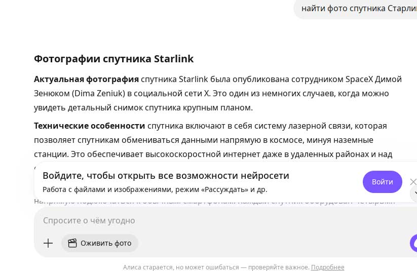 Точку в поисках поставила фраза от Алисы ИИ: "Актуальная фотография спутника Starlink была опубликована сотрудником ShaceX Димой Зенюком в социальной сети Х. Это один из немногих случаев, когда можно увидеть детальный снимок спутника крупным планом (не слишком качественное!)".
