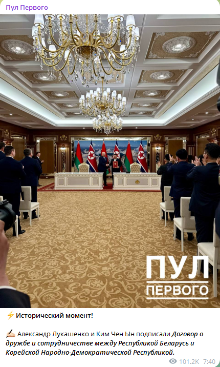 Когда под встречный марш машина с президентом РБ прибыла на место церемонии, товарищ Ким Чен Ын радостно встретился с товарищем Александром Лукашенко и горячо приветствовал его визит в Пхеньян.
