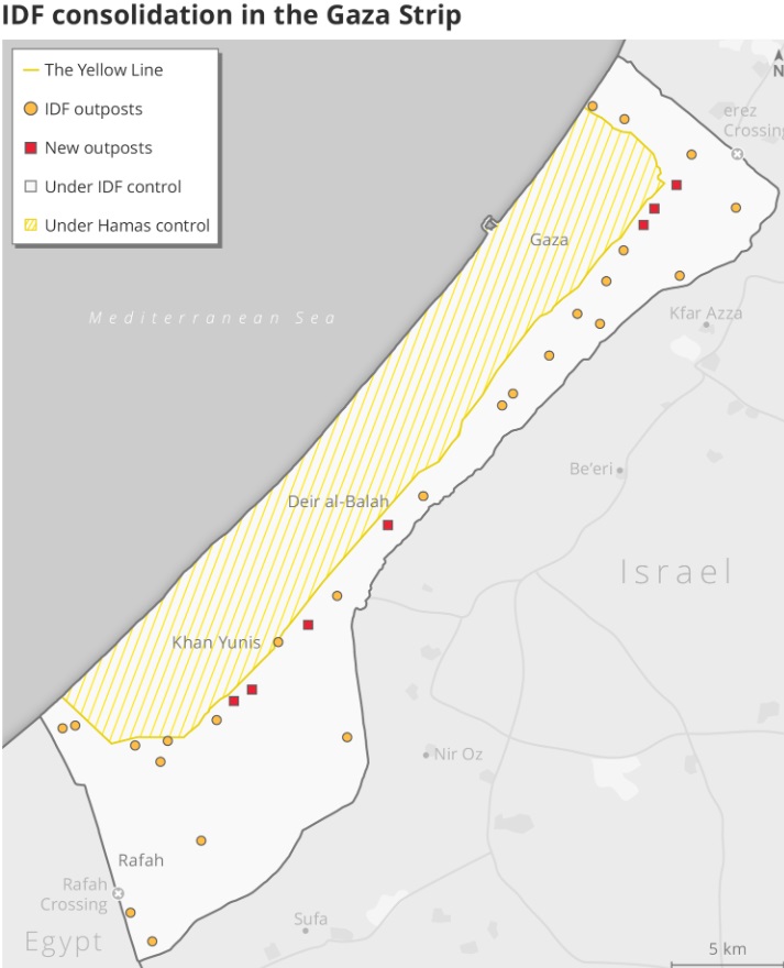 Пять месяцев назад установление "жёлтой линии" было представлено как этап процесса вывода головорезов Цахал из сектора Газа. Но с тех пор евреи создали вдоль новых границ концлагеря множество военных баз и расстреляли в районе линии по меньшей мере 224 палестинца, в том числе убивают детей во время сбора дров.