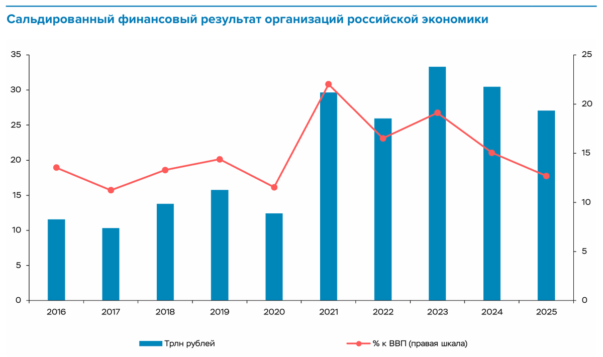 К примеру, сальдированный финансовый результат организаций российской экономики. По итогам 2025 года он составил 27,1 трлн ₽, что меньше на 3,9% в годовом выражении. Рекордные уровни были достигнуты в 2023-2024 годах.
