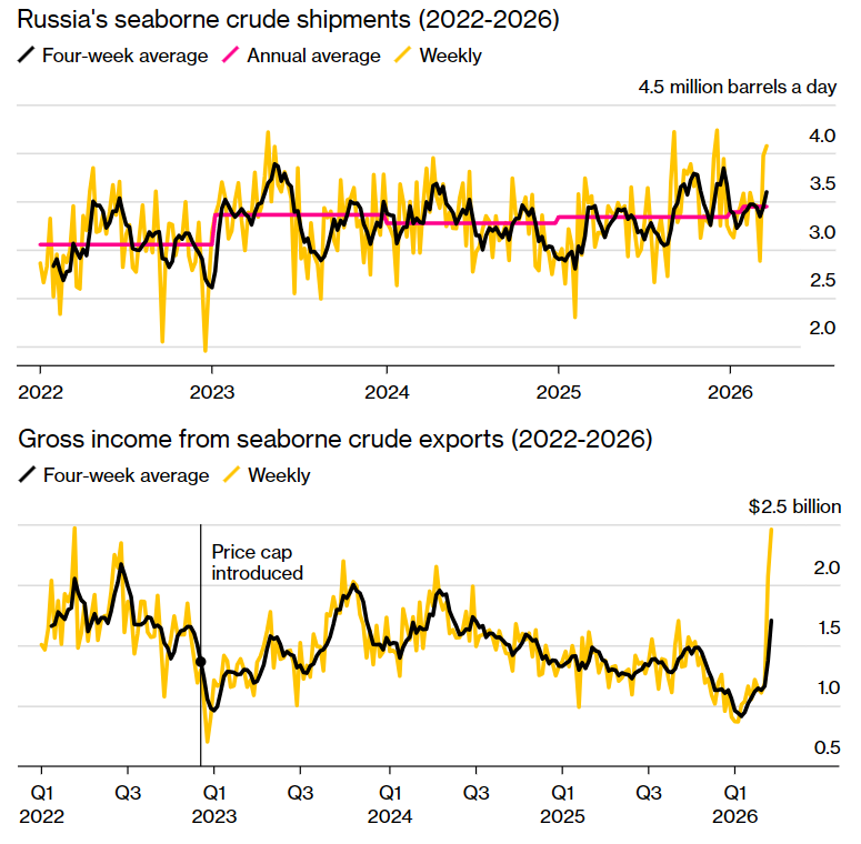 Весь мир накладывается санкции, вводит запреты, натягивает потолки. А Россия берёт и получает за прошлую неделю крупнейшую нефтяную выручку за 4 года. 2,458 млрд $.