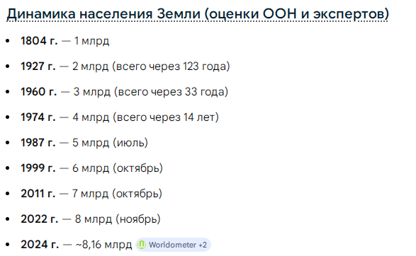 Если глянуть на Ваши цифры, то можно заметить, что прирост населения стабилизировался: с 5 до 6 млрд - 12 лет, с 6 до 7 - 12 лет, с 7 до 8 - 11 лет. То ли стали меньше рожать, то ли больше умирать.