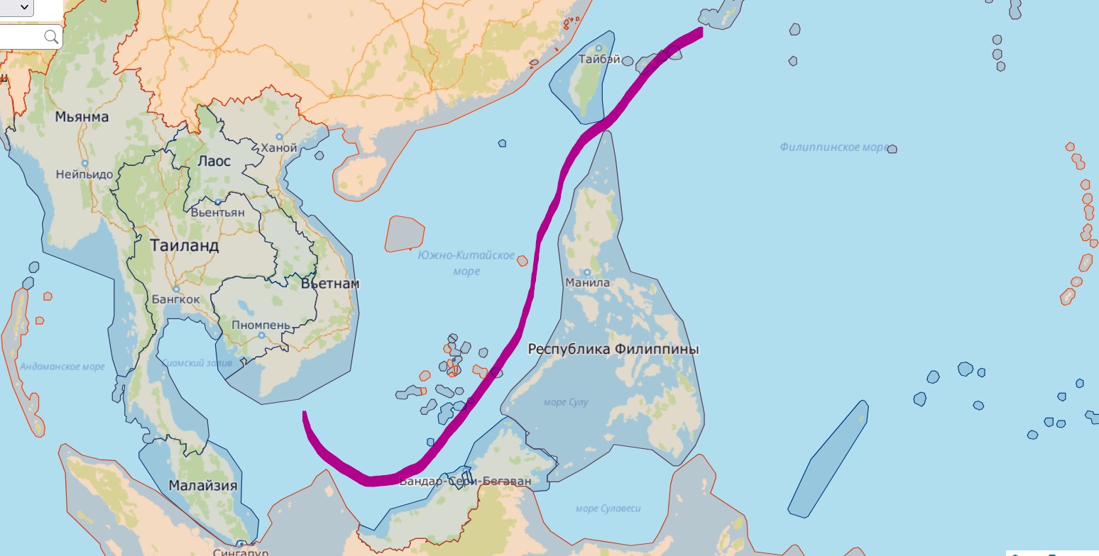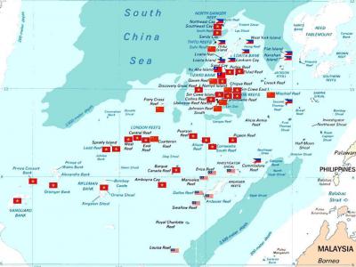 Это, собственно, архипелаг Спратли с флагами государств. Там обозначены: Вьетнам, Китай, Тайвань, Малайзия, Филиппины и даже Бруней. Заметьте – на островах вообще нет постоянного населения. Это – место присутствия. И дело совсем не в биоресурсах (ровно, как и на Курилах), дело в контроле морского пути. Уж ради биоресурсов Китай не стал бы тратить астрономические суммы, насыпая искусственные острова и даже строя на них аэродромы.