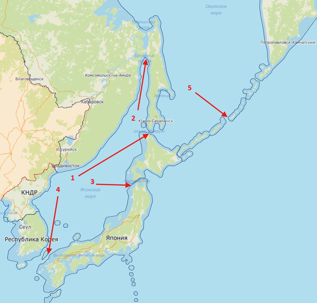 Что на юге? А там стрелка 4 упирается в остров с совершенно ничего нам не говорящим названием Цусима. Который делит пролив между все той же Японией и Южной Кореей на два рукава, шириной около 40 км каждый.