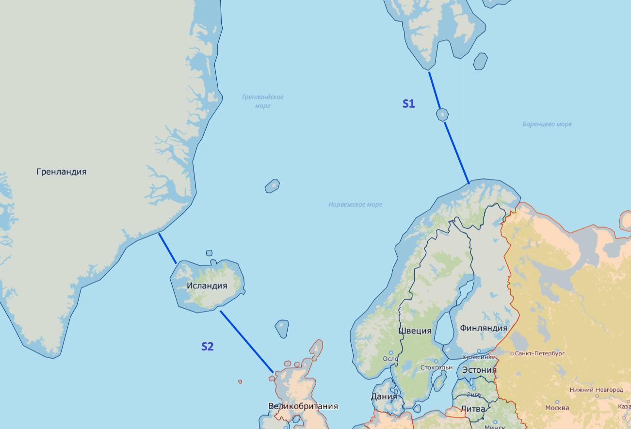 Переходим к рис.2. Нарисованные синие линии – два рубежа наблюдения системы SOSUS (система пассивных донных гидроакустических датчиков, призванная отслеживать советские АПЛ при выходе на боевое дежурство и «прикреплять» к ним противолодочные корабли НАТО). Как видно, система стояла как бредень, перекрывая все проходы. Первый рубеж – от Шпицбергена (Норвегия) через остров Медвежий (виден – тоже Норвегия) к собственно «континентальной» части Норвегии. Второй рубеж от Гренландии через Исландию к Шотландии. Система вступила в строй еще в конце 50-х годов (собственно, когда у СССР появилась первая АПЛ).