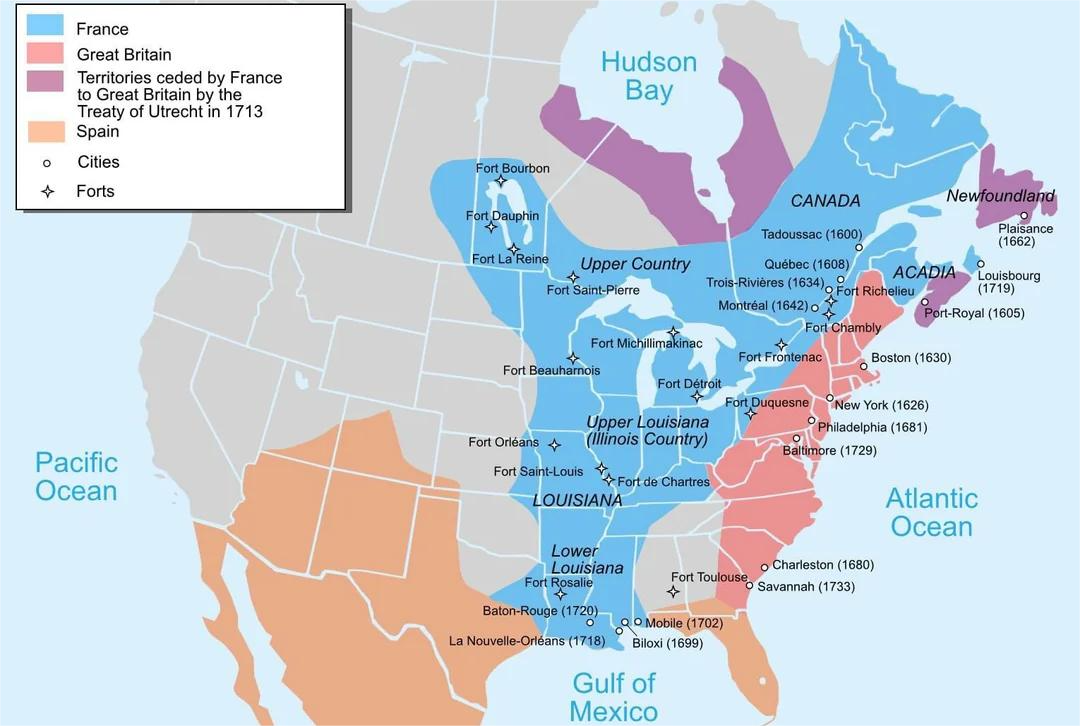 Конечно береговые колонии (которые сейчас 13 штатов) принадлежали Британии но руководствовался картой где часть принадлежит французам, испанцам, англичанам. Французы тогда владели не только Канадой.