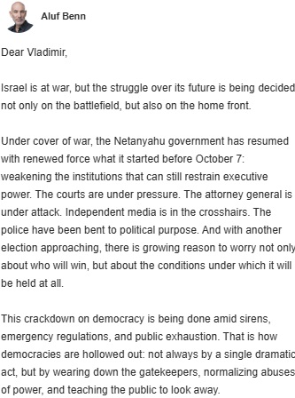Вчера по рассылке пришло мне письмо от главного редактора влиятельной израильской газеты "Гаарец" Алуфа Бена. Он жалуется, что в Израиле режим Нетаньяху "подавляет и разрушает демократию". Ой вей, не делайте мне грустно и смешно!