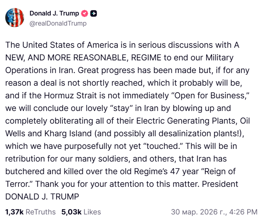 Соединенные Штаты Америки ведут серьезные переговоры с НОВЫМ И БОЛЕЕ РАЗУМНЫМ РЕЖИМОМ о прекращении наших военных операций в Иране. Был достигнут значительный прогресс, но, если по какой-либо причине соглашение в ближайшее время достигнуто не будет, что, вероятно, произойдет, и если Ормузский пролив немедленно не будет “Открыт для бизнеса”, мы завершим наше прекрасное “пребывание” в Иране взрывом и полным уничтожением всех их электростанций, Нефтяные скважины и остров Харг (и, возможно, все опреснительные установки!), которые мы намеренно еще не “трогали”. Это будет возмездием за многих наших солдат и других, что Иран устраивал бойни и убивал людей на протяжении 47-летнего “правления террора” старого режима. Спасибо вам за ваше внимание к этому вопросу. Президент ДОНАЛЬД Дж. ТРАМП