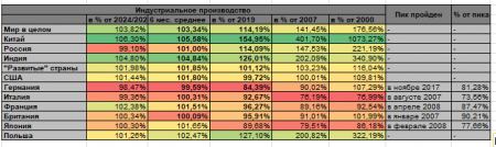 14. Текущий уровень индустриального производства по сравнению с 2000, 2007, 2019 и 2025 годом (первый и второй столбец отличаются тем, что в первом делается сравнение только последнего месяца с тем же месяцем год назад, а второй столбец берет 6-ти месячное среднее), а также когда был пройден пик производства, в тех странах, где он был пройден: