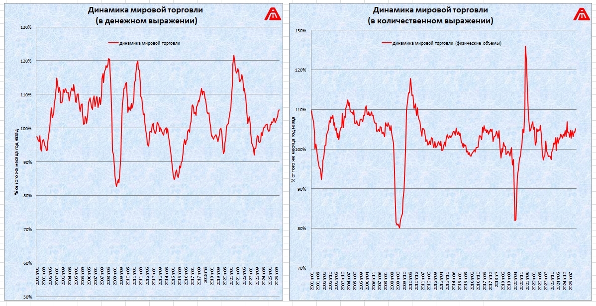 1. Мировая торговля в количественном измерении (физические объемы) выросла на 5.22% по сравнению с тем же месяцем год назад.