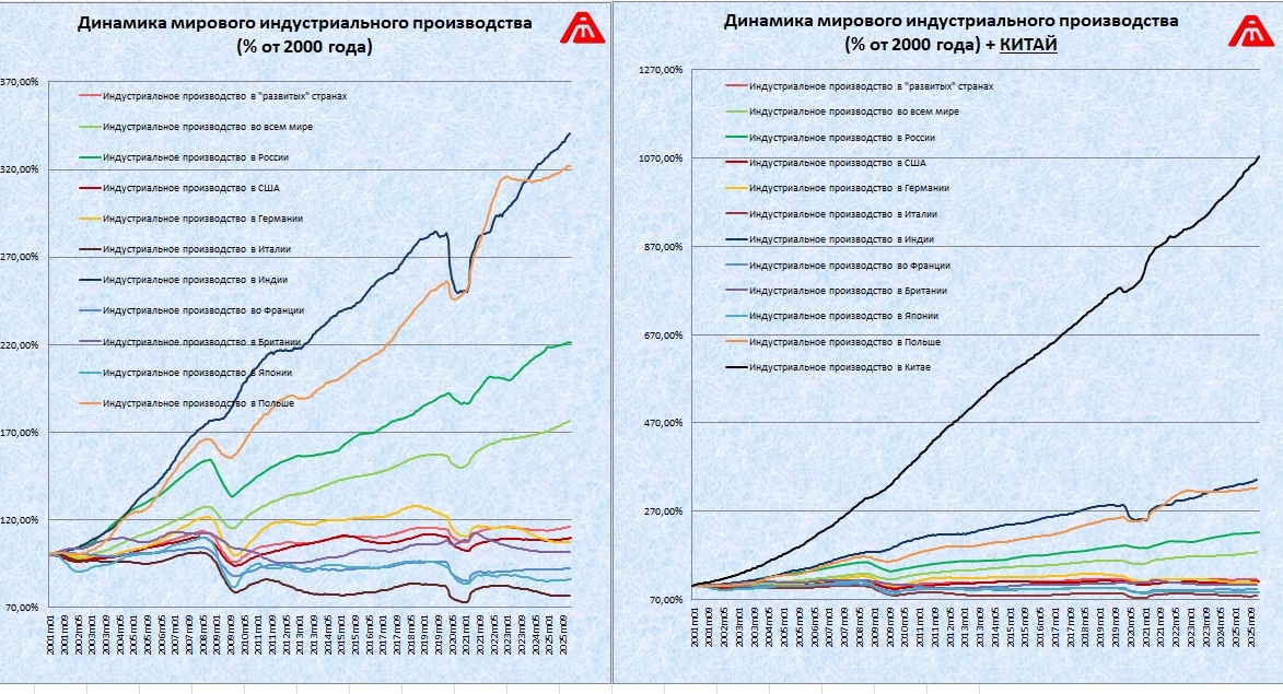 16. Индустриальное производство в процентах от уровня 2000 года (два графика отличаются исключительно наличием Китая, который нарастил производство за период более, чем в 10 раз, и связанным с этим масштабированием):