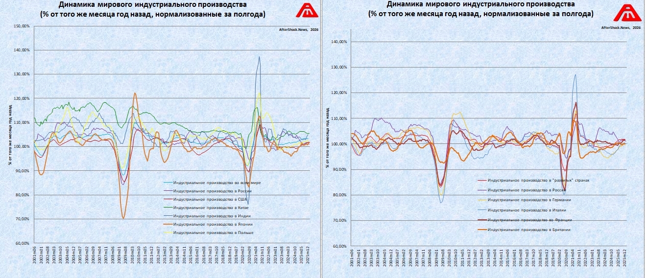 15. Индустриальное производство в процентах от того же месяца предыдущего года с нормализацией за полгода, Россия присутствует на обоих графиках для возможности сравнения: