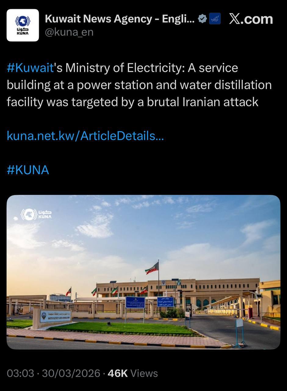 30 марта иранские военные опровергли информацию о недавнем нападении на опреснительную установку в Кувейте, назвав его американо-израильской операцией под ложным флагом, направленной на «дестабилизацию и разрушение региона».
