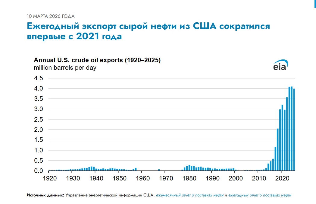 Представленная выше инфографика отражает динамику импорта и экспорта нефти в США с 1973 года на основе данных Управления энергетической информации (EIA). Она наглядно показывает, как страна прошла путь от глубокой зависимости от внешних поставок к статусу экспортера.