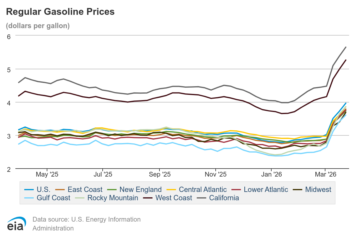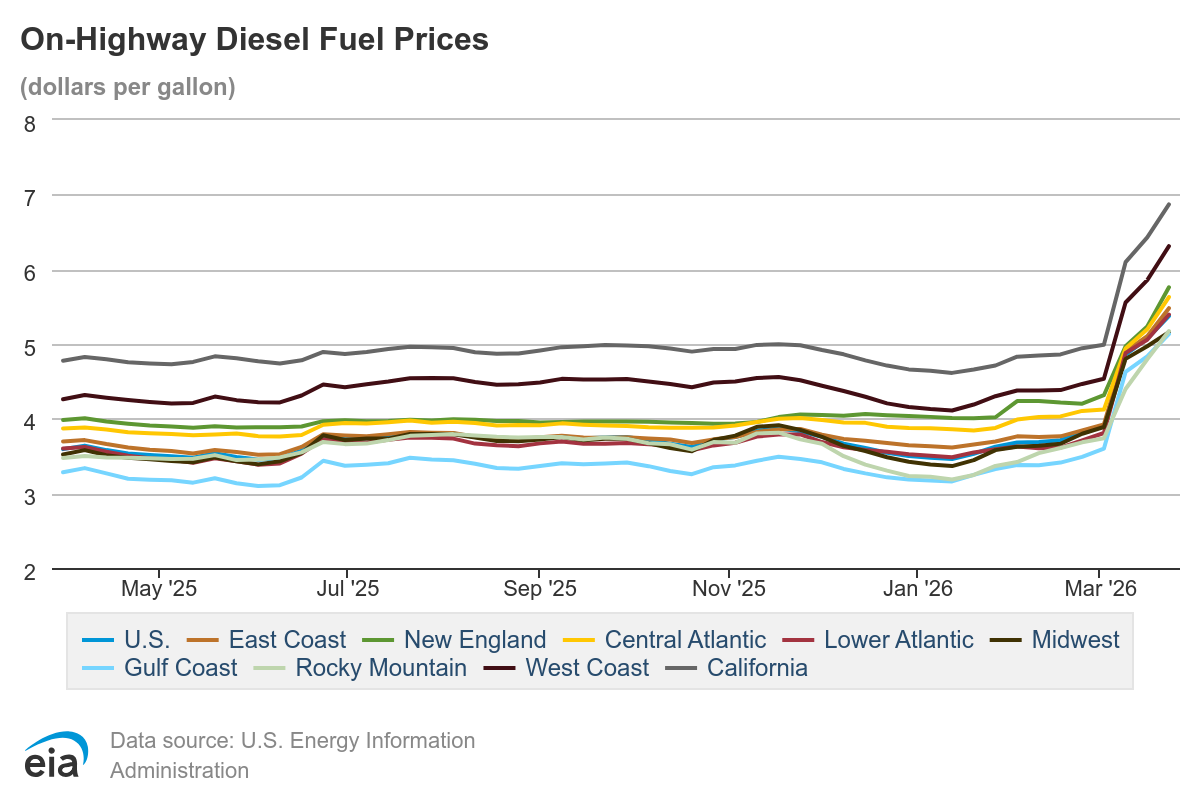 Хотя можно прикинуть по ценам, что с дизтопливом есть некоторые затруднения. По состоянию на 23 марта 2026 на заправках дизтопливо стоило в среднем 5.375 за галлон, а бензин - 3.961. Год-к-году рост цен +1.232 и +0.846 соответственно. Вот 2 графика с динамикой за год: