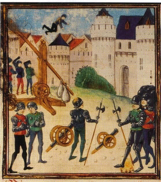 Однако слуга был схвачен стражей, знание гасконского ему не помогло, письмо было найдено. Французы решили дать понять гарнизону, что надежды на помощь у них нет. Для этого они привязали посланцу к шее письмо, зарядили его в требушет, и выстрелили им по замку. Вот одна из иллюстраций этого события: