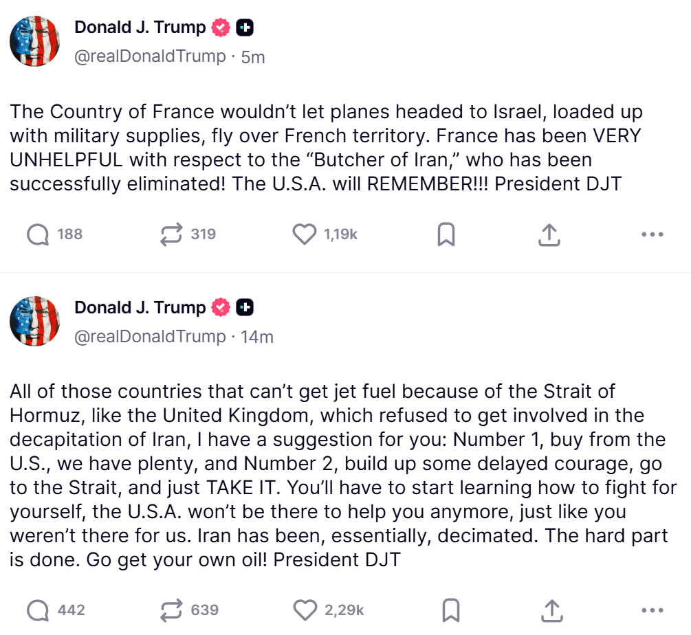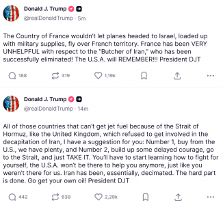 Франция не позволяла самолетам, направляющимся в Израиль и загруженным военными припасами, пролетать над французской территорией. Франция была ОЧЕНЬ БЕСПОЛЕЗНОЙ в отношении «Иранского мясника», который был успешно уничтожен! США ЗАПОМНЯТ!!! Президент Дональд Трамп.