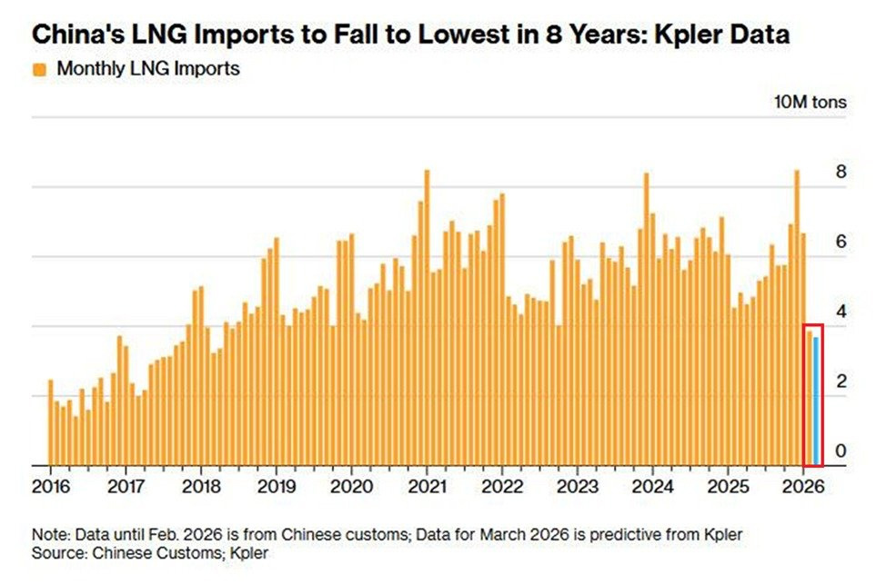 Всё идёт к тому, что за март 2026 Китай импортирует 3,69 млн тонн СПГ, что станет самым низким показателем с 2018 года. Вот ведь как получилось.