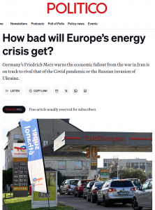 Глава энергетического ведомства ЕС Дан Йоргенсен уже рекомендовал правительствам стран ЕС в письме, впервые попавшем в распоряжение POLITICO, ограничить использование транспорта, чтобы компенсировать потерю критически важных поставок дизельного топлива и авиационного топлива из стран Персидского залива. Это послание, содержащее намеки на воскресенья без автомобилей и нормирование бензина, напоминает нефтяные кризисы 1970-х годов. Некоторые также предупреждают о приближении «энергетических локдаунов» в стиле COVID-19.