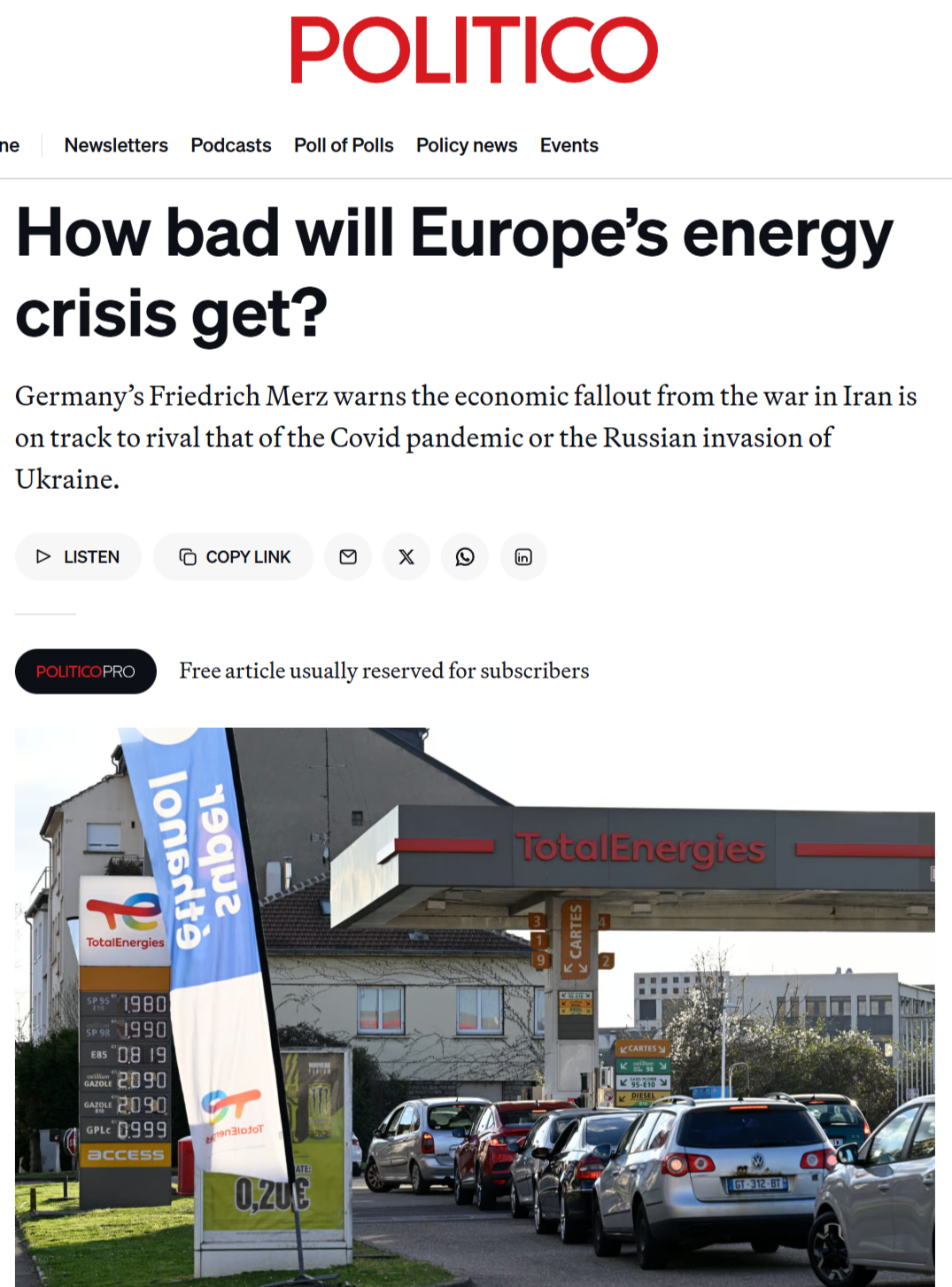 Politico: В условиях войны в Иране, которая грозит перекрыть потоки энергоносителей на обозримое будущее, Европа сталкивается с шоком поставок, который, как ожидается, парализует производство, приведет к остановке авиасообщения, повысит цены на продукты питания, резко увеличит стоимость заимствований и спровоцирует инфляцию на возвращение к кризисному уровню.