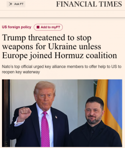 Financial Times: По словам источников, знакомых с ходом переговоров, Дональд Трамп пригрозил прекратить поставки оружия на Украину, чтобы оказать давление на европейских союзников и заставить их присоединиться к «коалиции желающих» по открытию Ормузского пролива.