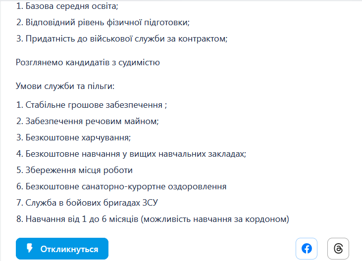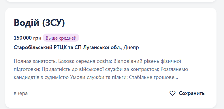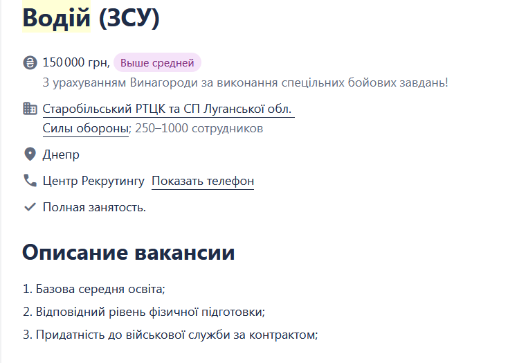 Вчера на главном украинском сайте по трудоустройству ТЦК впервые выкатило объявление. Думаю что это первая ласточка. Пытаются набрать отморозков в Днепре. Само объявление на мове приведено в скриншотах. Я сделал текст на русском для тех у кого с мовой сложно. Для понимания масштабов оплаты могу сказать что водитель категории В,С может рассчитывать где то на 25-30 000, водитель категории Е может рассчитывать на 40-60 000. Особо показательно их желание привлечь кандидатов с судимостью. Так хочется что даже отдельно в объявлении отметили.