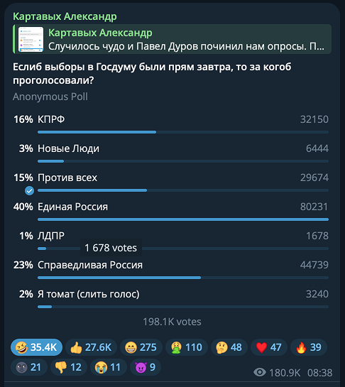 в телеграм-канале Новых людей 80% проголосует за Новых людей, а в ТГ канале ЕР - 146% за ЕР