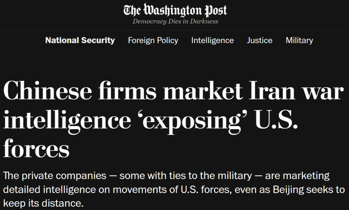 The Washington Post: Когда пять недель назад началась война в Иране, пользователи западных и китайских социальных сетей обратили внимание на волну вирусных постов с подробным описанием оборудования на американских базах, перемещений американских авианосных групп и информации о том, как военные самолеты готовились к ударам по Тегерану.
