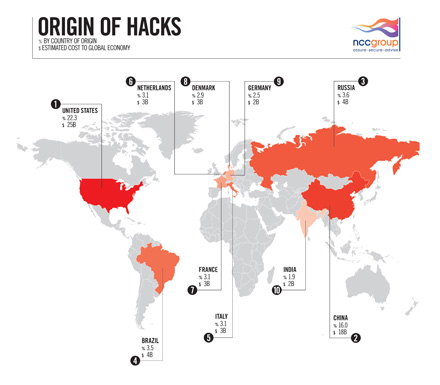 По данным исследования, США генерирует 22,3% всех попыток атаковать компьютеры. За ней следует Китай - 16%. По оценкам NCC Group, совокупно эти страны своими хакерскими действиями ежегодно наносят ущерб мировой экономике в размере свыше $43 млрд.