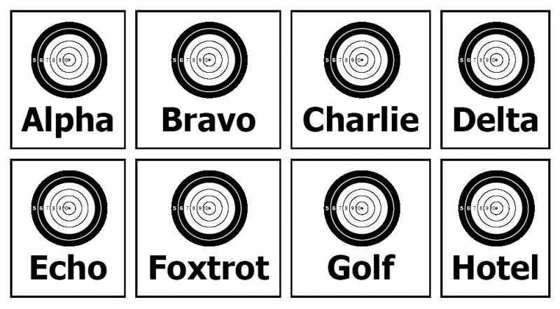 Имеется восемь проименованных целей (Alpha - Альфа, Bravo - Браво, Charlie - Чарли, Delta - Дельта, Echo - Эхо, Foxtrot - Фокстрот, Golf - Гольф, Hotel - Отель), расположенные в 30-50 метрах. Каждому стрелку присвоен личный номер. Судья называет номер стрелка и имя мишени, например - «Стрелок ПЯТЬ, ДЕЛЬТА», и сразу запускает таймер. У стрелка есть всего 3 секунды, чтобы выстрелить в названную мишень. В целом каждый стрелок делает четыре (4) выстрела, по одному за раз, по команде.
