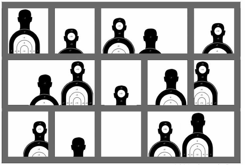 B. «Заложники в окнах» — Стрелки должны стрелять очень быстро, пытаясь поразить восемь (8) целей всего за 75 секунд. Баллы отнимаются, если поражается заложник.