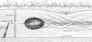 Графический продольный разрез участка русла реки, на котором видно, как с помощью простой яйцеобразной конструкции можно завихрить водные массы и смешать холодную грунтовую воду с тёплой водой поверхности, задав водам реки правильную температуру.