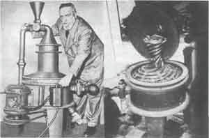 На фото справа изображено: Слева: Виктор Шаубергер с моделью домашней электростанции (1955 г.) Справа: блок домашней электростанции, видны спиральные витки, благодаря которым реализован эффект безвзрывного разрушения.
