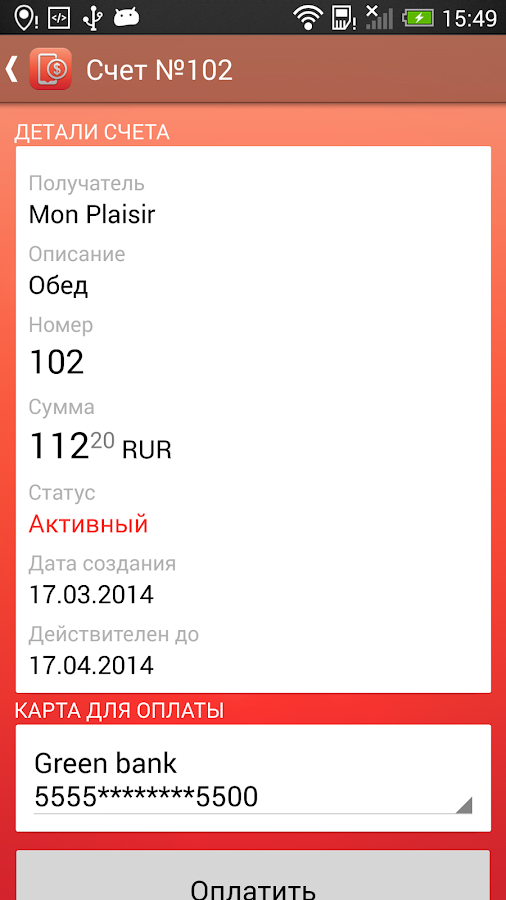 Приложение предназначено для выставления счетов на оплату клиентам платежного сервиса MobiCash. Вновь созданный счет может быть передан на клиентское устройство: