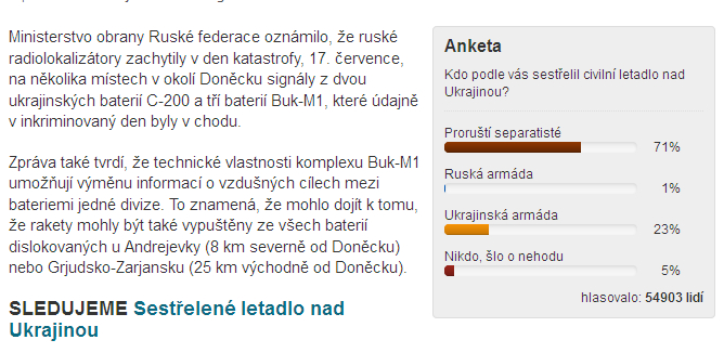 Голосовали себе спокойно чехи на этом ресурсе по всяким вопросам - внутренним и внешним - в том числе и по вопросу "Кто сбил Боинг". Голосовали до сегодняшнего дня, до 19 июля