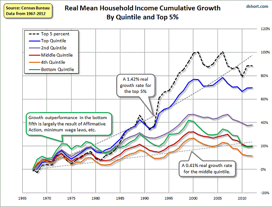 Любопытный график ниже показывает динамику реальных доходов домохозяйств США в разбивке по квинтилям (самые богатые 20% и т.д.), пунктирной линией показаны самые богатые 5%. Видно, что во время дезинтеграции физической экономики США, начавшейся в 60-х (справка), именно самые богатые стали выгодоприобретателями процесса, подобно опарышам, глодающим организм: