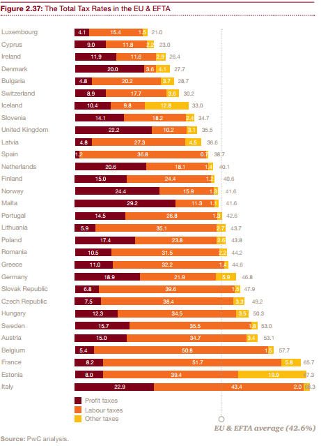 Херовый ты бизнесмен, коли не слышал про косвенные налоги, такие как госпошлины, акцизы или тарифы госмонополий. Вот данные из отчёта Вемирного Банка за 2013. Не говоря уж про такие неучтённые в этом отчёте "налоги", как принуждение к платным медицинским услугам по причине непредоставления "бесплатных" при наличии всеобщего принудительного медстрахования.