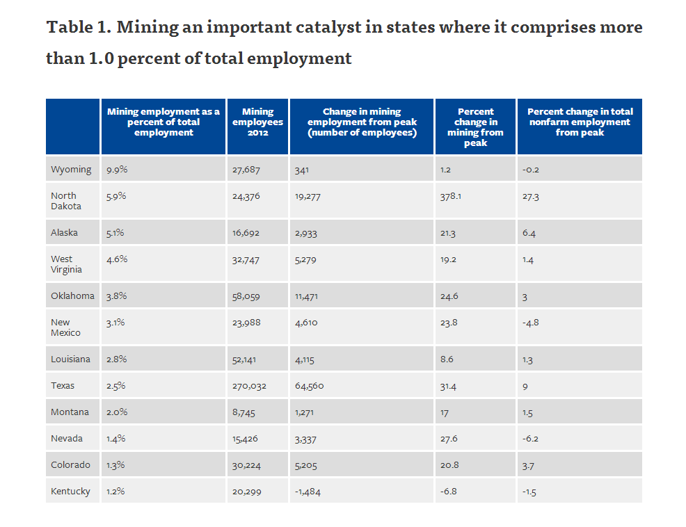 Лидеры - Северная Дакота (+27.3)%, Техас (+9%), Вашингтон (+7%), Аляска (+6.4%). Секрет прост - с декабря 2007 по апрель 2014 количество занятых в добыче ресурсов увеличилось на 171 тысячу (до 852 тысяч):