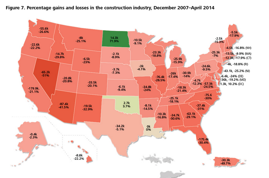 И в США начинается транзит к сбору хвороста (который, очевидно, кардинально ускорится при отключении США от колониальных налогов), а вместе с ним - великая миграция населения. Вот карта, показывающая какие штаты прибавили рабочие места в период с 2007-2014: