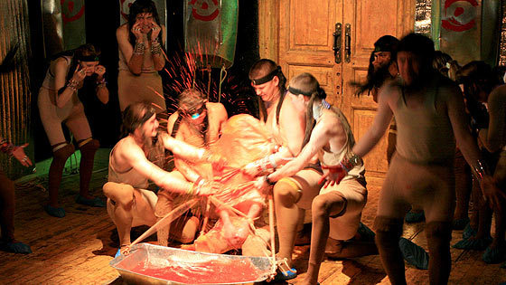 Подданные эти выглядят сообществом существ, которых Шекспир назвал «бедное, голое, двуногое животное». На них только нижнее белье, они гримасничают, растягивая пальцами губы, и всю гамму чувств выражают писком.