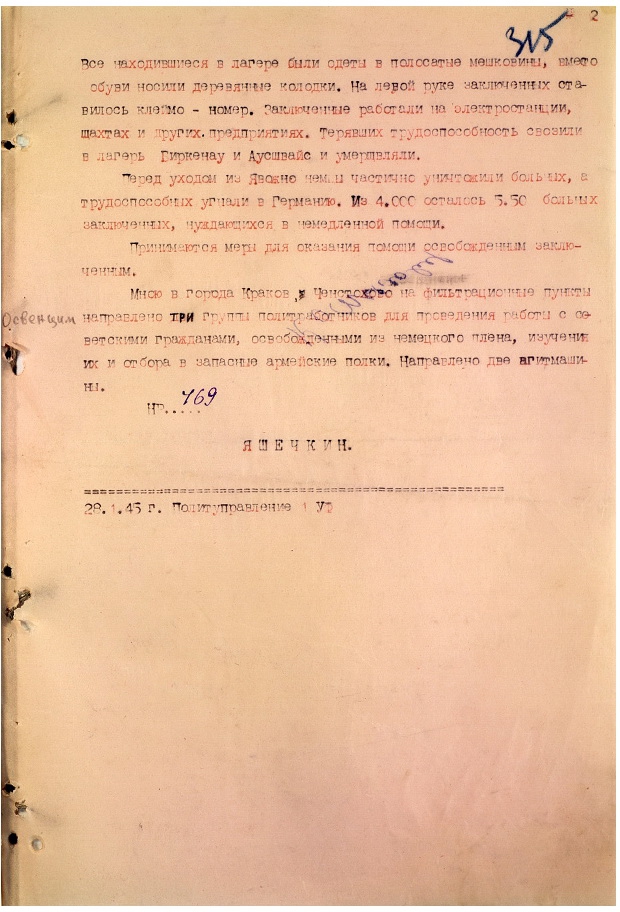 Донесение Члена Военного совета 1-го Украинского фронта Секретарю ЦК КПСС Маленкову Г.М. о лагере Освенцим от 29 января 1945 г.Подлинник. Машинописный текст.