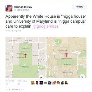 «Оказывается, Белый дом это «nigga house», а университет Мэрилэнда — «nigga campus». Потрудитесь объяснить, Google»