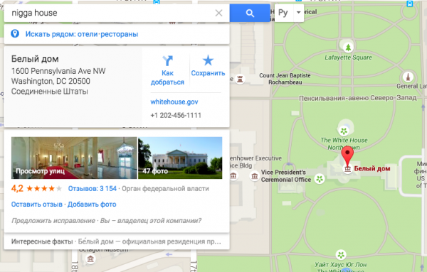 Пользователи соцсетей обнаружили, что запрос «nigga house» в разделе карт Google приводит к Белому дому, официальной резиденции президента США Барака Обамы.