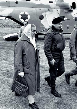Голда Меир и начальник штаба израильской армии генерал Хаим Бар Леф совершают облет пограничных поселений в долине Иордана. Около 1970 года. Фото FOTOBANK.COM/GETTY IMAGES