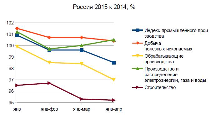 На этом графике данные 2015 года приведены в процентах к соответствующим периодам прошлого (2014) года. Следует помнить, что приведенные индикаторы носят ярко выраженный циклический (сезонный) характер, и в начале каждого года как раз формируется «низкая» база отсчета. Как видим, в данном случае, динамика в среднем не блестящая, хотя о сломе долгосрочного (многолетнего) растущего тренда пока говорить, наверное, рано.