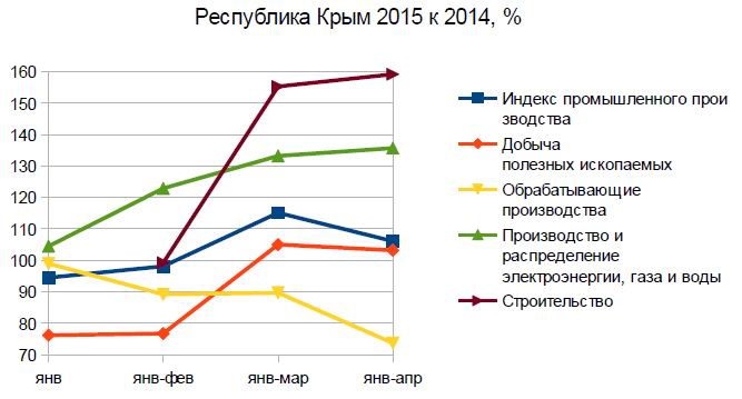 Данные, видимо, без Севастополя — но он уж совсем мелкий субъект — за гранью статистической погрешности. Данных по строительству за январь не обнаружил, поэтому ломаная линия строительства начинается с периода «январь-февраль». База сравнения (начало 2014 года), конечно, невысока, но какая уж есть: еще в б/У, а не в России она сформировалась.
